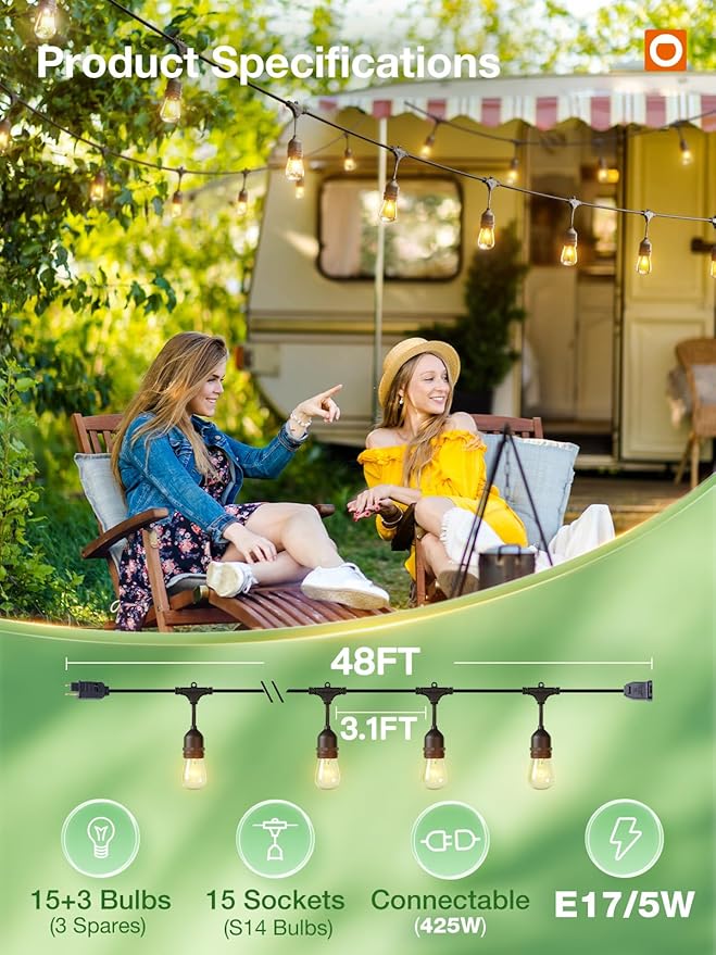 - [Including 1JCD-DL/E178 Edison Bulbs] Each strand contains 15 hanging sockets, provided with 18pcs 5W S14 incandescent glass bulbs. The distance between bulbs is approximately 3.11FT. This heavy-duty light is bright enough and ideal illumination anywhere