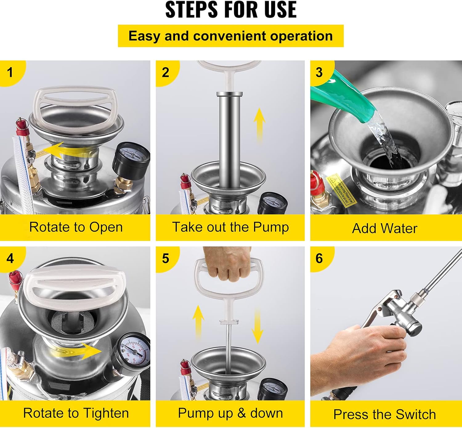 - Durable Stainless Steel: Capacity: 1.5 Gal; Pressure: 1.5-4.0 Bar. Our hand pump sprayer is made of stainless steel, rust-proof and durable. Pay attention that the rubber ring and internal design are not suitable for strong corrosive, acidic, and base solutions.