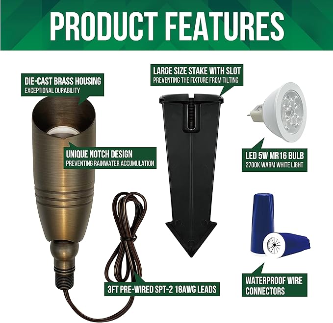 - ✔READY for DIY: Every light comes with 1pc high quality 5W MR16 LED bulb, 1pc rugged ABS slot ground spike, 2pcs waterproof silicone-filled wire nuts (1 #14 w/1-3 #18 or 20, 2 #14 w/1 #18), and 3ft pre-wired SPT-2 18AWG leads.