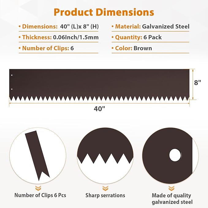 - Enhancement Kit - Each set includes 6 steel edges, measuring 40 inches (length) x 8 inches (width), and 6 clips for efficient installation. Experience the convenience and quality of our steel garden edges, adding brilliance and color to your landscape project