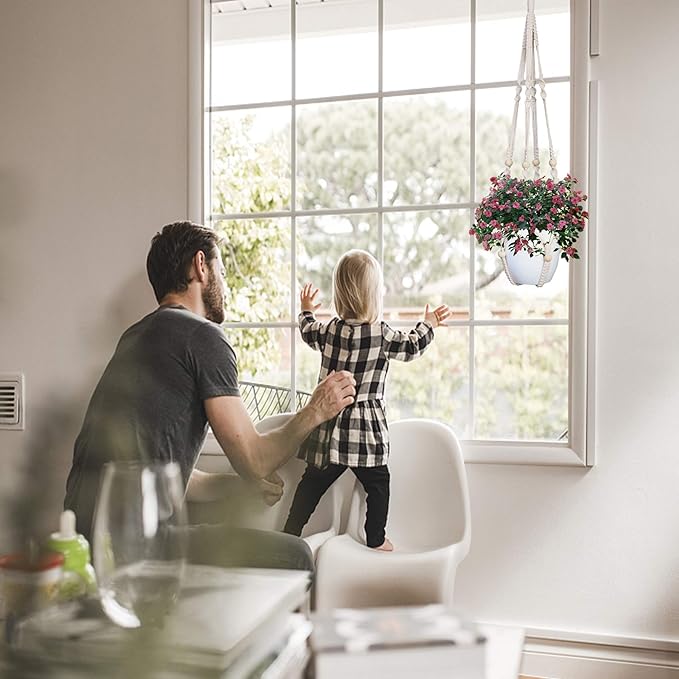 - Great Decor: The macrame hanger is suitable for living room,bed room,ceiling,bathroom,plant hanger also the perfect decoration for yard,porch,plant corner,office and apartment.This hanging plant holder will meet your indoor and outdoor decoration needs,help you save more space and avoid naughty pets and children from breaking the flower pot.Show your plants some love with this modern, vintage-inspired macrame plant holders,bring depth to your Boho plant hangers indoor macrame décor
