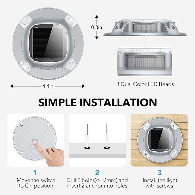 - 【DUAL COLORS & DOUBLE SURPRISES】2 Colors IN 1 (cool white or warm white) to make the solar deck lights not only can be driveway markers lights, warning step lights and guiding lights but also as solar outdoor decoration lights to beautify your house, garden and patio. Two-color modes, fit for different adornment styles perfectly!