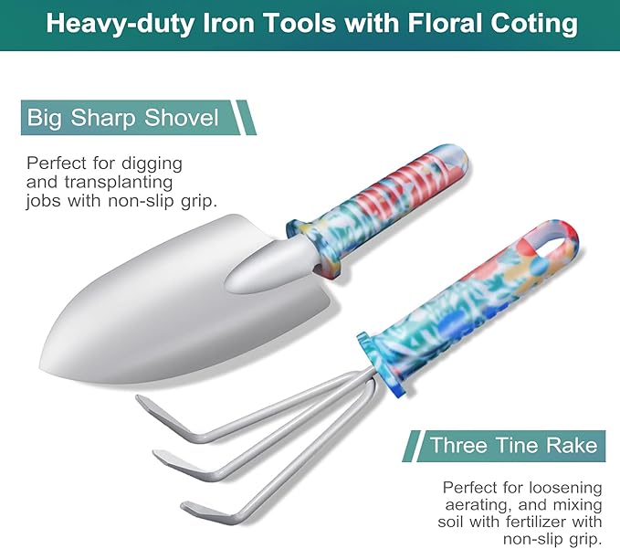 - Unique Design & Multifunctional: Improved iron heads, no paint loss. Plastic molding water sprayer. Rubber handles printed with floral patterns. Lightweight makes gardening easier and more enjoyable. Perfect for a variety of tasks including digging, weeding, raking, loosening soil, aerating, transplanting, pruning, and watering to meet all your requirements for indoor and outdoor gardening