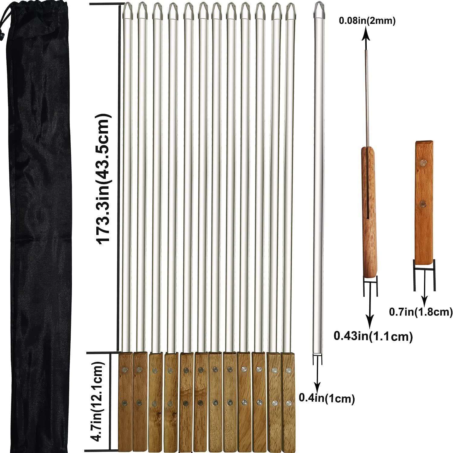 - Premium Materials- Made of stainless steel 430, 0.4 Inch Wide, 22 Inch Long with real Wood handle. Stainless Steel Thickness: 2mm. This thing is made out of quality material, you can almost use it as SWORD ! 12 Pack, each skewer tip has a silicone cap protector.