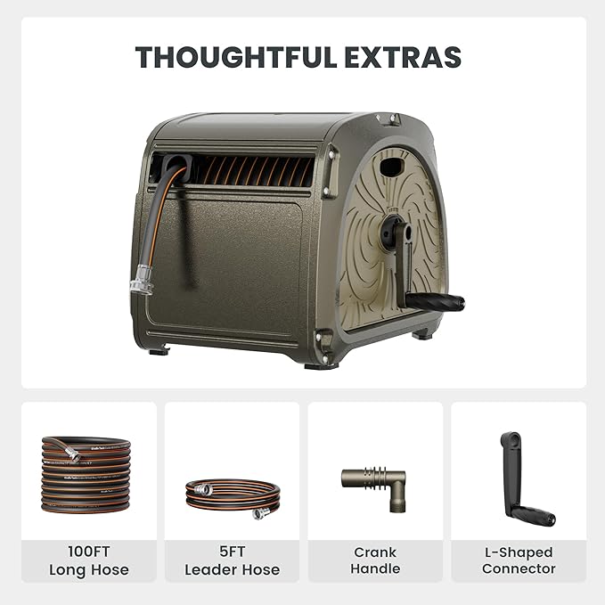 - COVER EVERY CORNER: The heavy-duty hose reel is pre-installed with a 5/8'' 100 ft hybrid hose, which can cover every corner of your garden and complete daily cleanings and waterings.