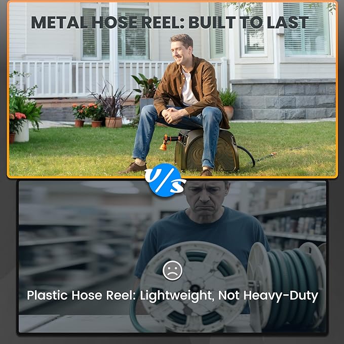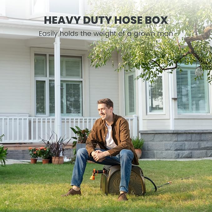 - STURDY & DURABLE: The hose reel box is coated with anti-rust material, which can stand firmly under extreme weather. The Aluminum connections guaranteed no leakage, and the heavy metal shell will make it stands firmly when used.