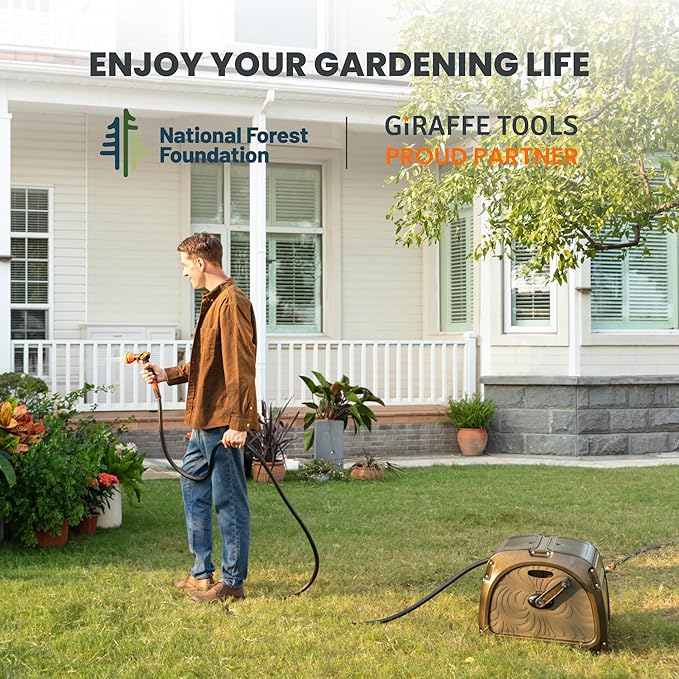 - STABILIZING FOOTREST: The Giraffe Tools hose reel is equipped with a stabilizing footrest to ensure that the hose and reel kit remain securely in place during winding and unwinding.