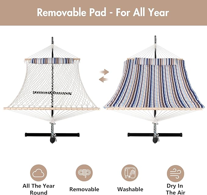 - COMFORTABLE & DURABLE: Double-layered quilted polyester fabric with inner polyester wadding is soft, breathable and long-lasting. Special sewing design increases the beauty and practicality of hammock swing. Extra polyethylene stuffing head pillow offers you superior comfort. Hammock pad is detachable for easy cleaning. It will not fade after long-term use
