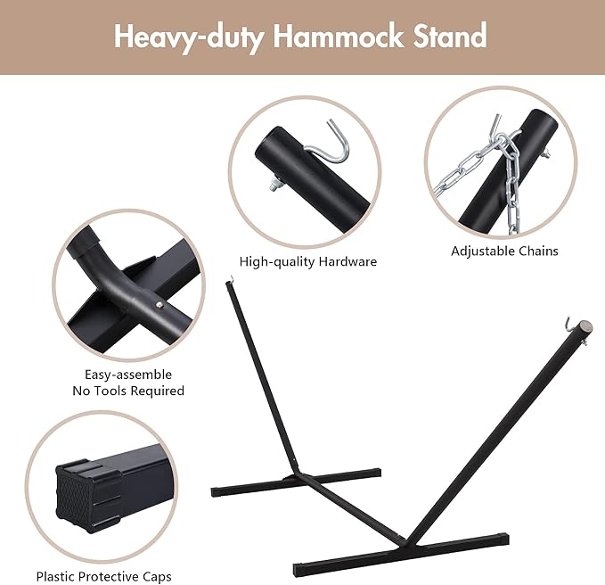 - STEEL STAND FOR HAMMOCKS: Hammock stand is made of heavy-duty gauge steel, featuring safe, durable and weather resistant. It can be easily assembled in minutes without any tools. Including a magazine bag and a cup holder, this 12 ft hammock with stand included is very suitable for reading, relaxing, and resting in the garden, terrace, backyard, poolside or balcony
