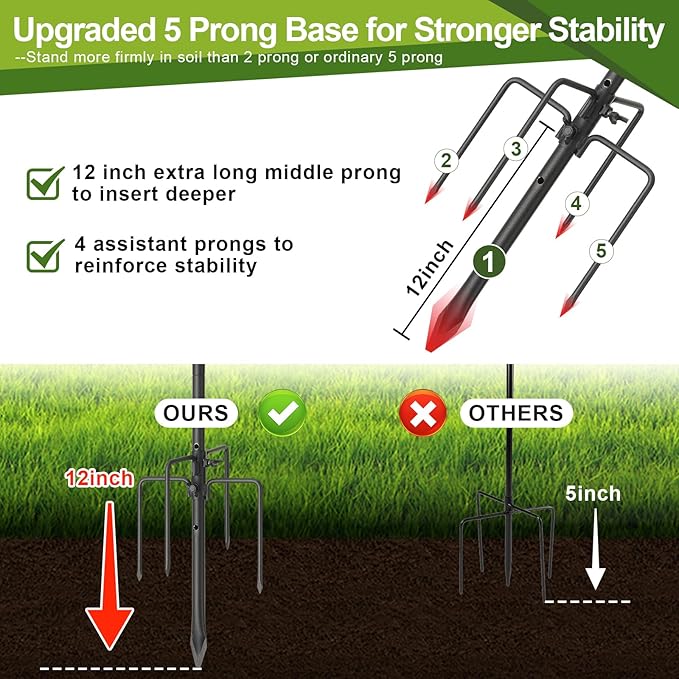 - Rock-Solid Stability, From Soft Soil to Hard Soil:Features a unique 5-prong base with an extra-long 12" center spike and 4 side prongs, this upgraded design keeps your hummingbird feeder pole stable - even in loose or sandy ground. No more tipping or wobbling in your outdoor garden,yard or flower beds.