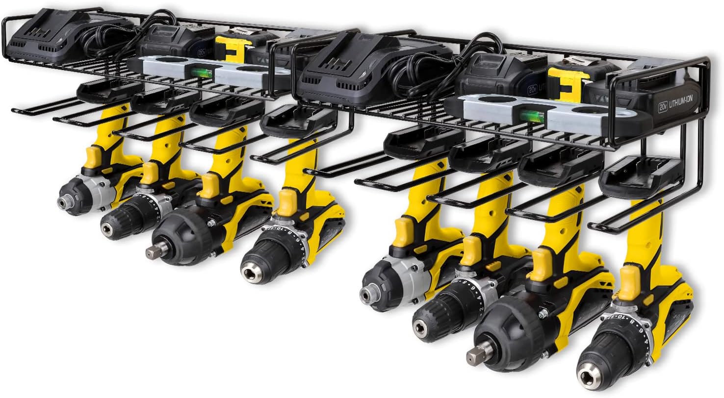- [Much More Loading Capacity] This power tool holder with heavy duty design would help you to load maximum 100 lb tools by using all 4 wall mount anchors. This power tool storage, for top shelf max load 40 lb and below 4 tool slots with max capacity 80 lb.