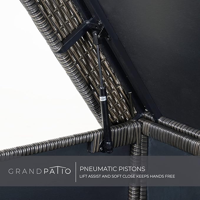 - UNIQUE DESIGN: Children friendly two pneumatic pistons for easy lift and soft closure, a feature you will appreciate when you have your hands full. Combined with water resistant widened lid to protect your belongings better, meanwhile you can open outdoor wicker storage easily by front pull. Holes at bottom of patio storage box for good ventilation to keep inside clean.