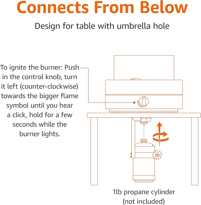 - Runs on a 1 pound LP gas tank (not included); tank hides out of sight underneath unit via included bracket