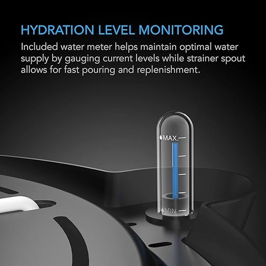 - Included gauge displays the current water level while the strainer spout enables quick replenishment.