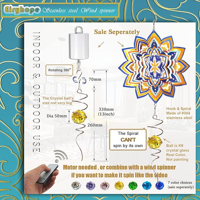 - 【 3D Wind Spinners Stabilizer 】The wind spinner spiral with a 360° swivel hook is easy to hang. Our wind spinner crystal tails are gorgeous additions to our range of 3D wind spinner accessories. Attached to the bottom of kinetic wind spinner, which adds another dimension to the overall look, also helps provide stability on windy days. Since the Wind Spinner Stabilizer Spiral Tail can't spin on its own, add a wind spinner motor (not included) to help it spin.