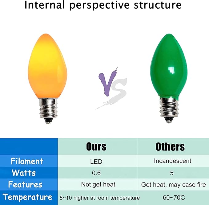 - Energy Saving LED Bulbs- C7 multicolor christmas led lights with E12/C7 candelabra socket base. Each bulbs 0.6 watt,120 Volt, 2700K warm white. Energy-saving c7 christmas lights replacement bulbs do not generate heat, and the temperature is lower than that of traditional incandescent bulb. low wattage will save more energy for you.