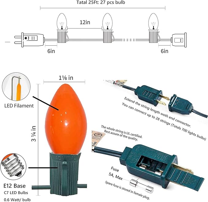 - C7 LED Christmas Lights- 25Ft Christmas LED string lights with 25 Opaque Multi color C7 LED light bulbs- Red, Blue, Green, White and Orange bulbs, total length 25 feet. Commercial grade indoor outdoor Christmas decorative lights.