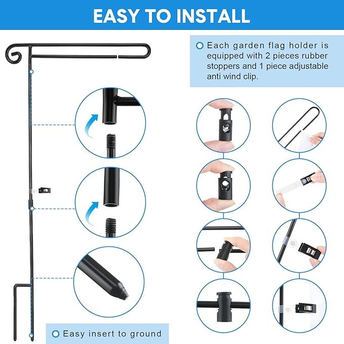 - Weather Resistant and Sturdy: the garden flag stand is made of metal, with thickened grounding rod and reinforced welding point, which is stable and sturdy, not easy to bend or break, with the black powder coating, which is weather resistant and rust proof