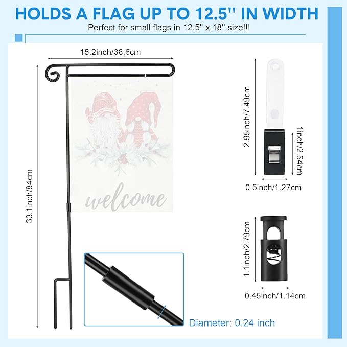 - Appropriate Size: the metal garden flag stand measures 15.2 inches in width, 33.1 inches in height, 0.24 inches in diameter, weight about 0.83 pound, suitable size fit for most small flags; The 3-piece folding rod is convenient to store, will not take up too much space
