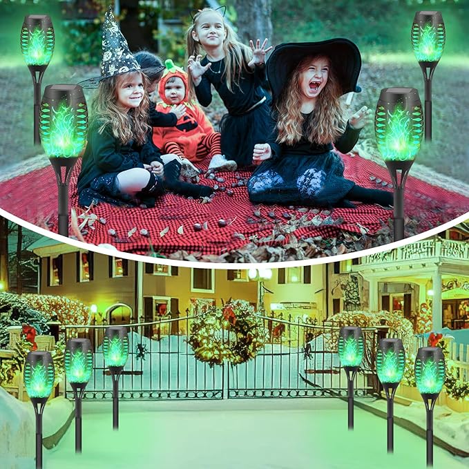 8-Pack Green Solar Flickering Flame Torches – Waterproof Solar Garden Lights, Outdoor Solar Lights for Yards, and Flame Torches for Patio and Pathway Decorations