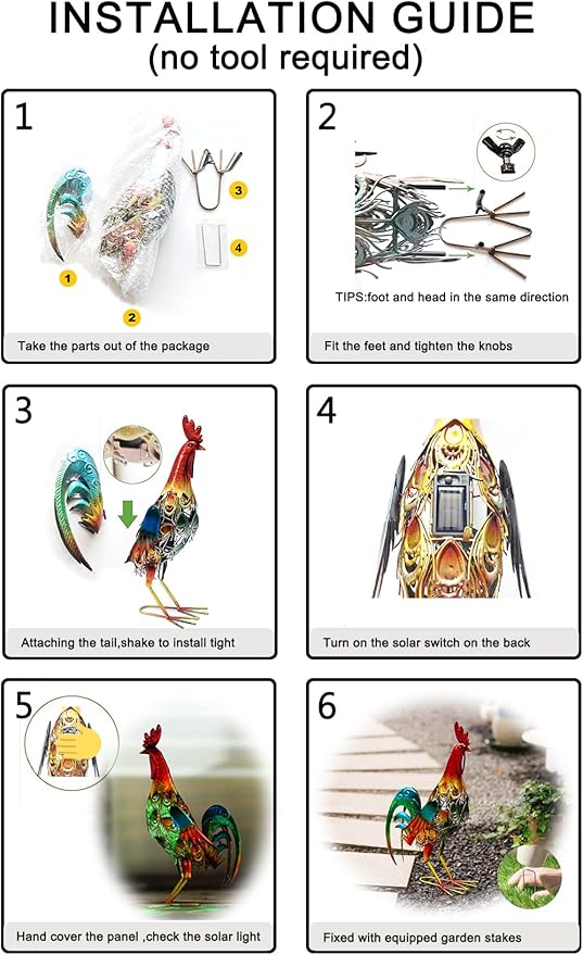 • Perfect Garden Decoration: This solar powered Metal Rooster Statue is suitable for garden, trees, flowers, flowerbed, fence, walkway decoration. You can enjoy vivid color during the daytime and soft light at night.
