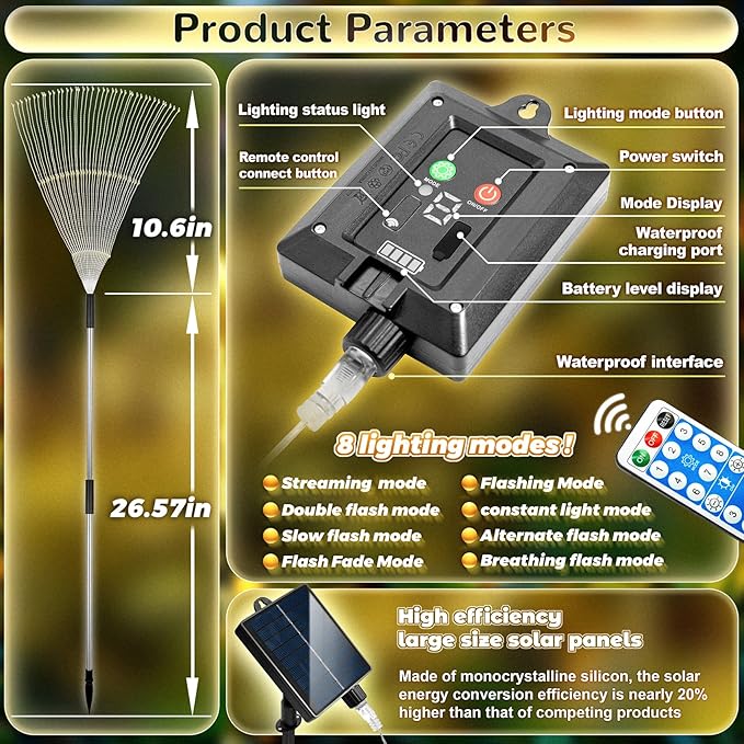 - Easy To Install Solar String Lights: The solar fireworks string lights are connected by a 4-meter wire and the package also includes an upgraded solar panel that can power up to 4 sets of solar fireworks lamp, which can last for 8-10 hours after charging