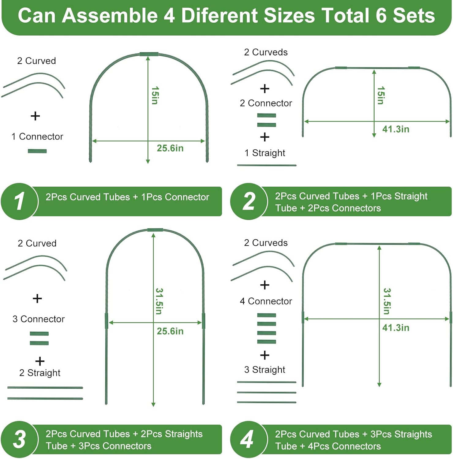 - 🌱【Greenhouse Hoops DIY Kit Include】: Garden Bed Hoops contains 16 curved tubes, 24pcs Stright Hoops,32 pcs connecting pipes and 24pcs clips (a total of 8 sets of greenhouse hoops 41.3" in Wide, 31.5" Height) You can combine with hoops to DIY your own grow tunnel, it can be DIY 4 Different Types.And you can use the clips to fix the greenhouse covering.