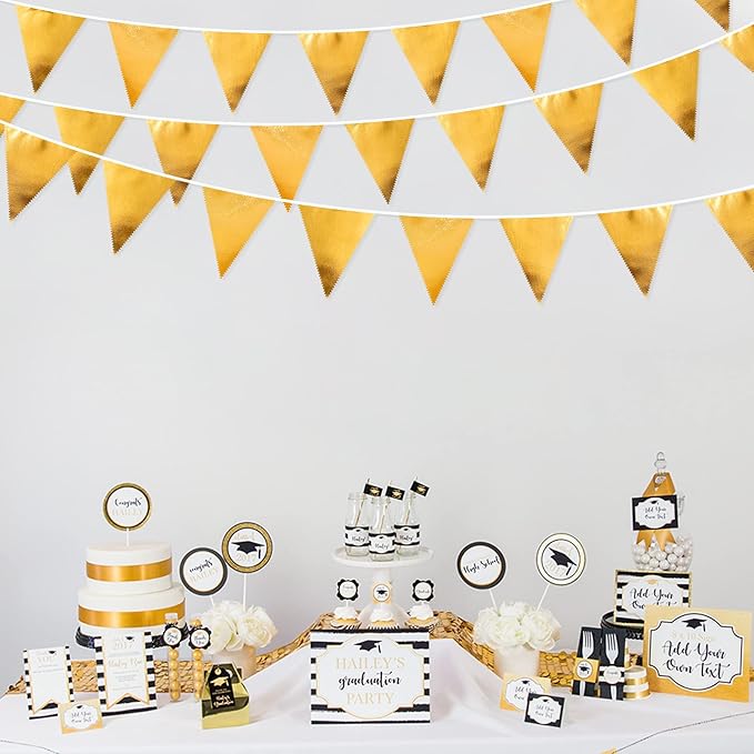- PERFECT CHOICE - This gold triangle garland flag are good ideal for any kind of celebration,party,festival,events or other occasion.It can be used for both kids and adults.Such as birthday,wedding,bachelorette party,anniversary,baby shower,retirement party,family gatherings,graduation,outdoor activities,picnics,holiday party,Christmas,new year party,hen party etc.