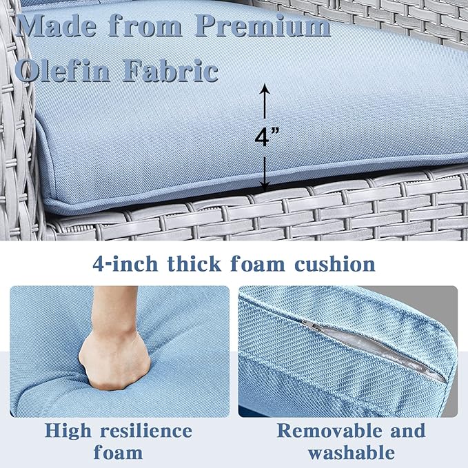 - Comfortable And Easy To Clean: Each glider chair and sofa in this outdoor set comes with a 4-inch thick foam seat cushion and an 8-inch thick cotton back cushion, which is ergonomic and enhances the overall comfort of the chair. The chair cushion cover is made of outdoor professional olefin fabric which is water resistant, and the seat cushion is equipped with zippers that are removable and easy to clean.