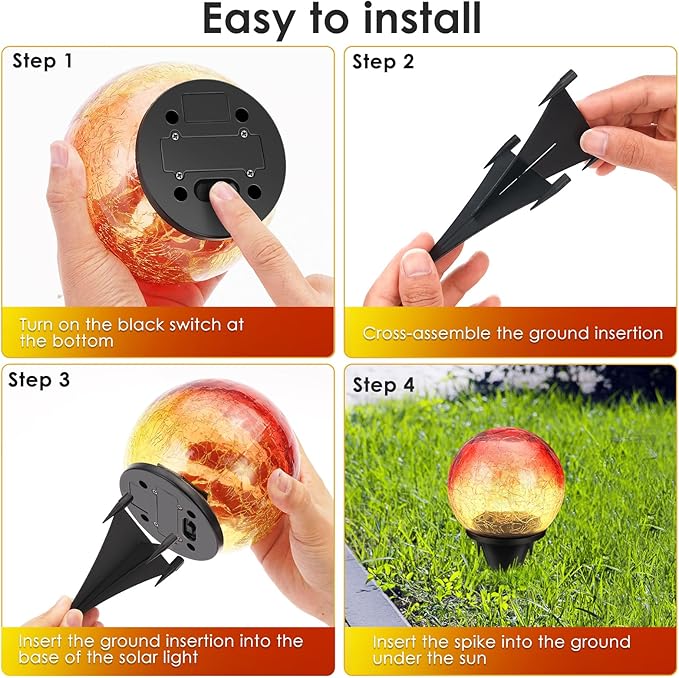 - 2 Easy Install Way: Solar powered, no battery or outlet needed, super convenient to use. It just need only 10-15 seconds to install the solar lights on places it absorb full and direct sunlight. The solar globe lights outdoor can be placed on the table, floor or inserted into the ground with a plug-in board. Try to soften the ground with water and dig a suitable hole for the spike if the ground is too hard