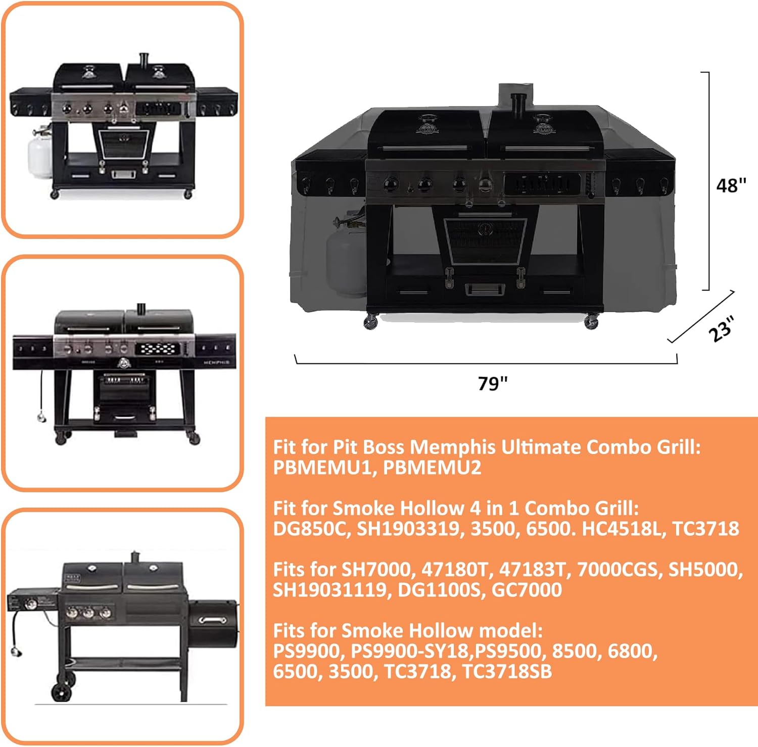 - Compatible: Outdroor cover fits for Pit Boss Memphis Ultimate Combo Grill: PBMEMU1, PBMEMU2. Fit for Smoke Hollow 4 in 1 Combo Grill: DG850C, SH1903319, 3500, 6500. HC4518L, TC3718 etc. Fits for SH7000, 47180T, 47183T, 7000CGS, SH5000, SH19031119, DG1100S, GC7000. Fits for Smoke Hollow model: PS9900, PS9900-SY18,PS9500, 8500, 6800, 6500, 3500, TC3718, TC3718SB etc.