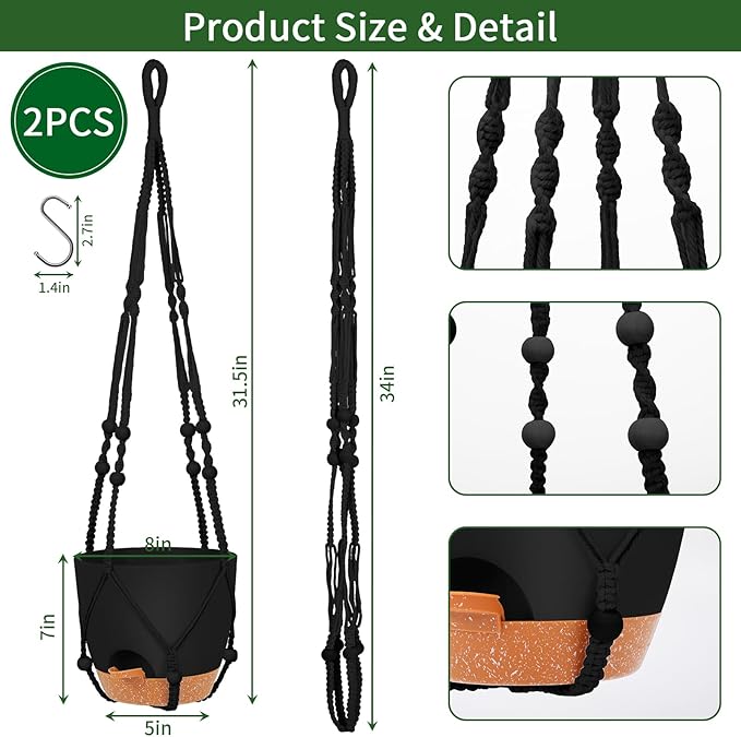 GARDIFE 8 Inch Hanging Planters with Macrame Plant Hanger for Indoor and Outdoor Plants, 2 Pack Large Self Watering Hanging Plant Pot with Basket Flower Pot with Drainage Hole, Black