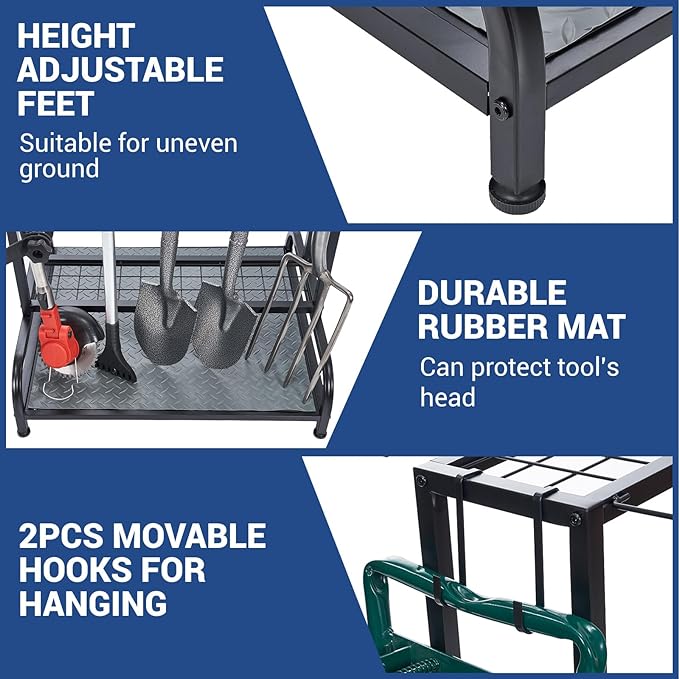 - STRONG DURABLE STEEL CONSTRUCTION: This garage tool rack and shed organizer made of a durable coated steel frame that’s sturdy enough to withstand indoor or outdoor use. The thickness of the steel pipe has been upgraded to 2 cm, making it more sturdy and durable. You won't worry about collapsing like a plastic organizer