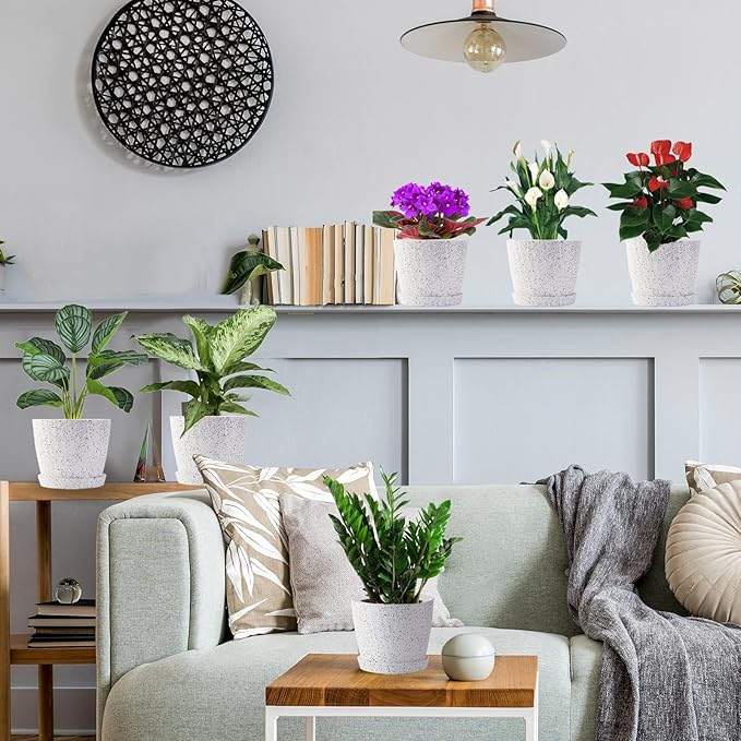 7 Inch Plant Pots Bulk, 6 Pack Plastic Planters with Drainage Holes and Saucers for Indoor Outdoor House Plants and Flowers, White Speckles