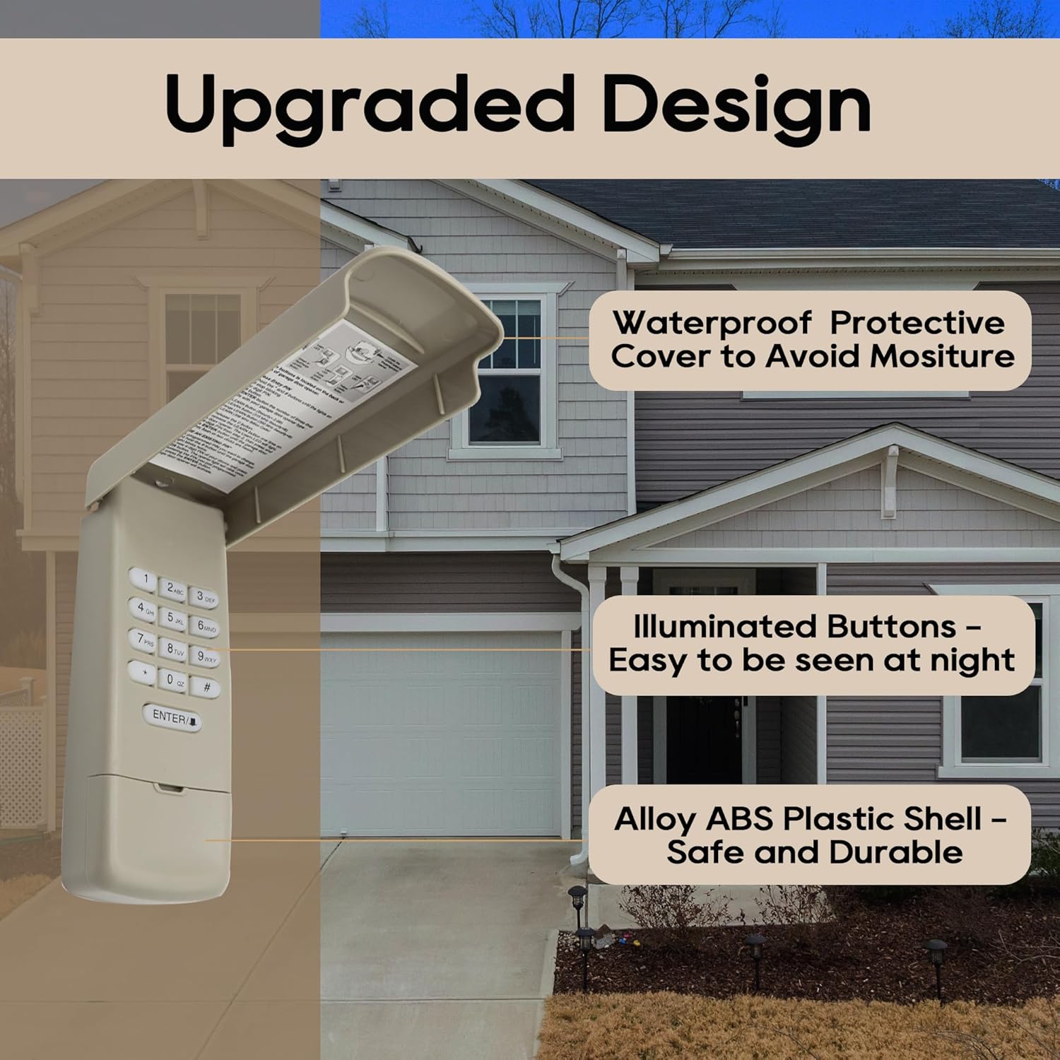 - 【Convenient Design】The garage door keypad is completely wireless, which is powered by battery (included); Clamshell design and waterproof material extend the service life; the backlit numeric button allows for quick and convenient code input in the dark.
