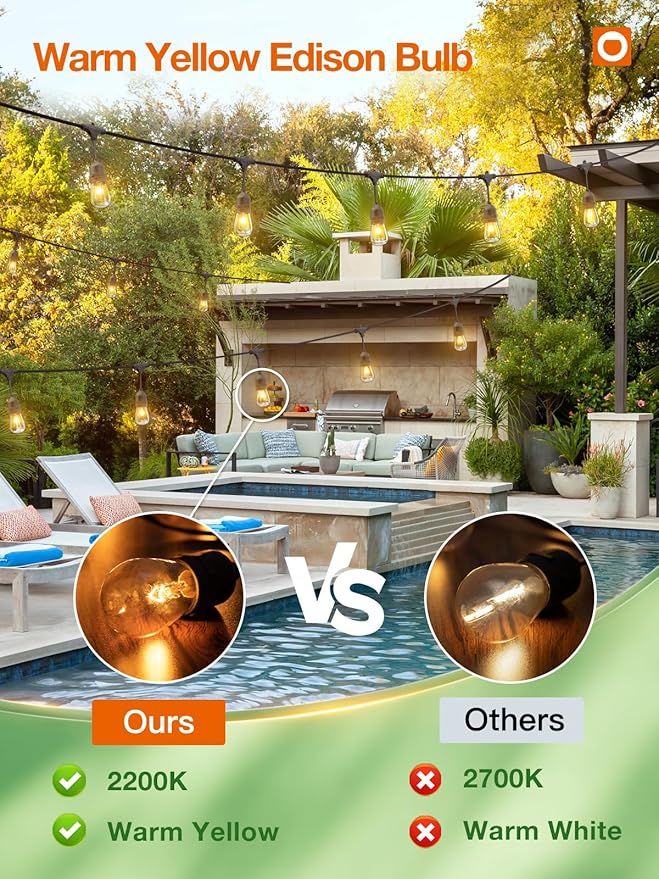 - [Timer Control] Edison outdoor string lights provide 4 timing modes (2H/4H/6H/8H), which can be controlled by remote control to turn off the lights at a fixed time. Turn off the lights at specific times to save power