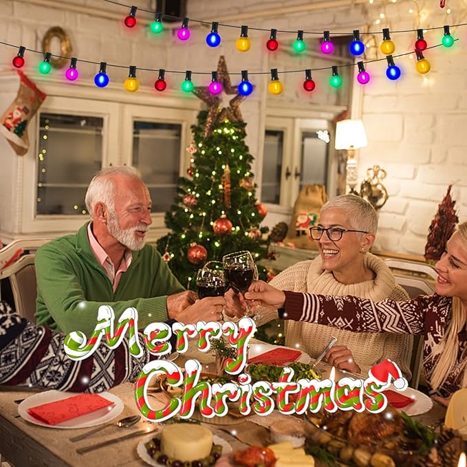 - ✨Safety and Energy Efficient: 50Ft G40 LED Christmas string lights Outdoor with 27 led shatterproof frosted multicolor bulbs (2 Spare), C7 or E12 Candelabra base, each G40 frosted multicolor led bulb 0.6W, outdoor led christmas multicolor patio string lights is more than 90% energy efficient than vintage edison globe string lights. G40 frosted colorful bulbs string lights emit a mesmerizing, multicolor brilliance, creating a captivating and festive atmosphere.