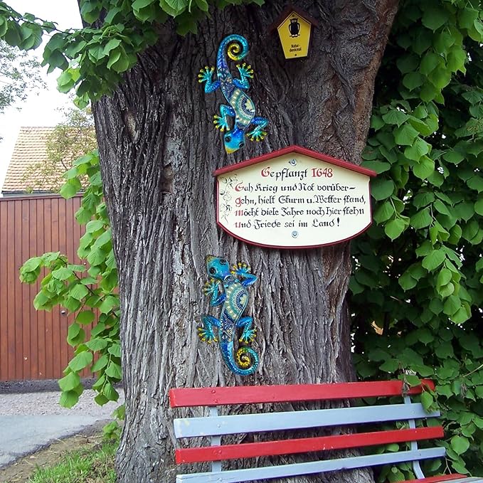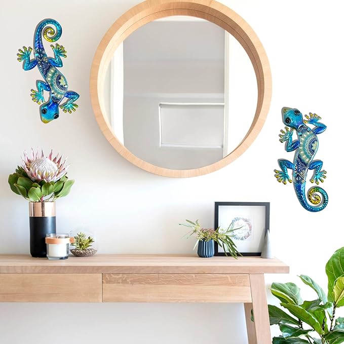 - đŚăDesignă metal lizards outdoor decor measures 12*5.5*0.6 inchďźsuitable size for any space. Exquisite lizard wall-hanging suit uses Dreamy blue gradient as the main color, with the same color Bohemian pattern, vivid curly tail and 3d eyes, which will bring special decoration to your garden
