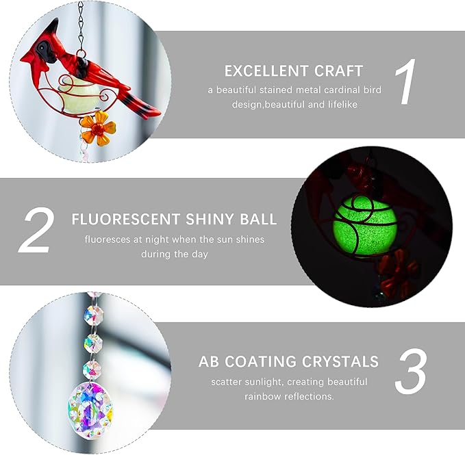 - Stunning Stained Metal Design - This 13-inch long sun catcher features a beautiful stained metal cardinal bird design, also containing a fluorescent endothermic shiny ball, it fluoresces at night when the sun shines during the day, adding a touch of elegance and charm to your space.