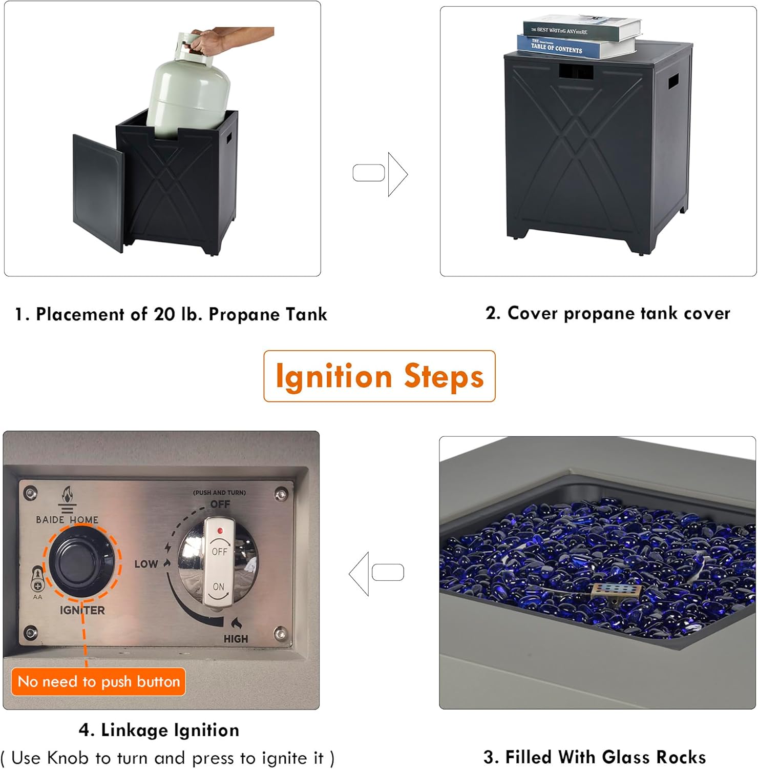 - Boasting a robust 50,000 BTU heat output, this outdoor gas fire pit provides powerful and effective warmth. It features electronic ignition and a flame control knob that allows you to adjust the flame size from low to high. Utilize a standard 20 lb propane gas tank (Tank not included).