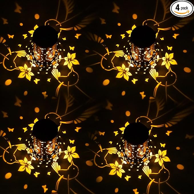 4 Packs Solar Lanterns Outdoor Hanging Lantern Lights, 4 Hummingbird Hollowed-Out Metal Decor Lantern, Waterproof LED Decorative Garden Light Gifts