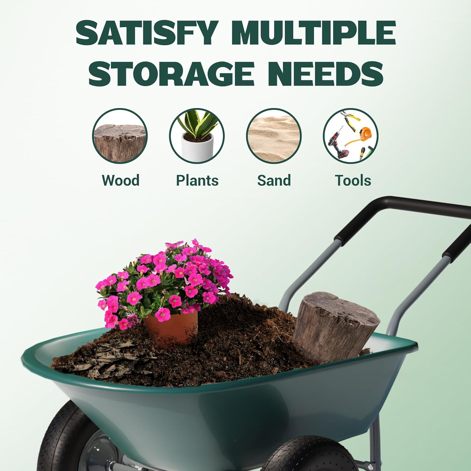 - 330 POUND CAPACITY WHEELBARROW: The strong push wagon can hold up to 330 pounds of soil, firewood, or tools; Equipped with durable wheelbarrow tires, ensuring smooth transport while helping maintain a clean and organized outdoor space