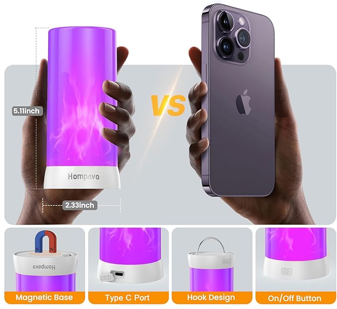 - 【Magnet Base & Hanging Hook Design】The rechargeable flame light has magnet base and hanging hook, plus its IP44 waterproof outer shell, you can easily place it in anywhere firmly.
