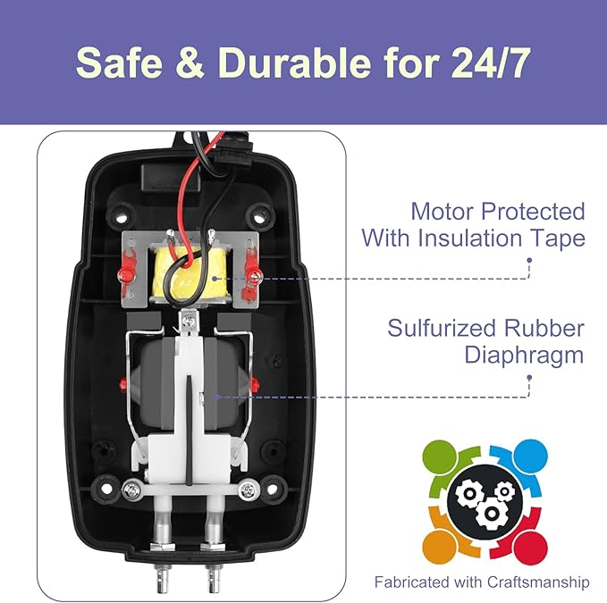 - SAFETY & DURABILITY - The sulfurized diaphragm of this pond bubbler enhances its durability, ensuring long-lasting performance. Additionally, the chrome-plated air outlets are corrosion-resistant, further contributing to the pump's durability and longevity.