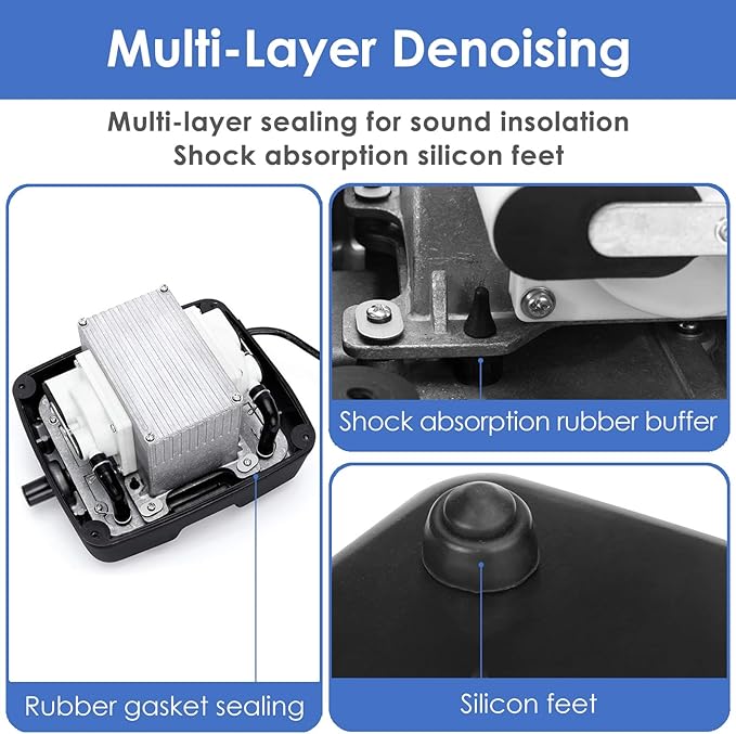 - QUIET – This linear air pump is designed with multiple layers of denoising to achieve low noise operation – Enlarged surface of the housing, perfect sealing of air chamber, widely used rubber and silicone buffer, most importantly the suspending magnetic-driven diaphragm.