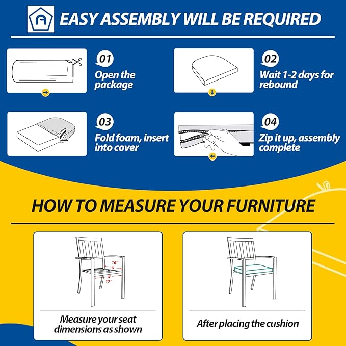 - Wide Use & Tips: These outdoor dining chair cushions fit pools, patios, balconies, decks, backyards, and gazebos. Foam inserts and covers are packed separately in bags and placed in one box—check all parts. Easy assembly required