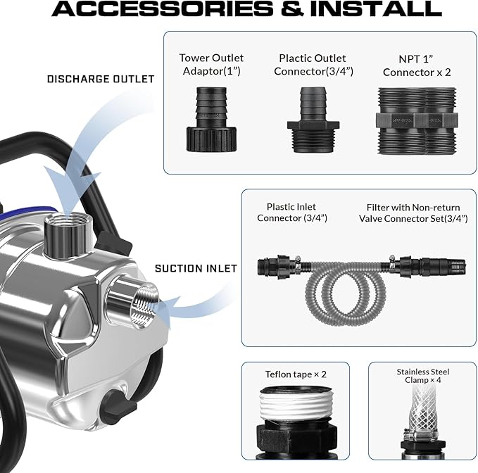 - Installation of this water transfer garden pump is quick and easy. It comes with a check valve featuring a filter function, ensuring water purity and reducing the risk of motor blockages. Additionally, it features a 1" NPT discharge and suction, along with rich 1" and 3/4" garden hose adapters for versatile connectivity.