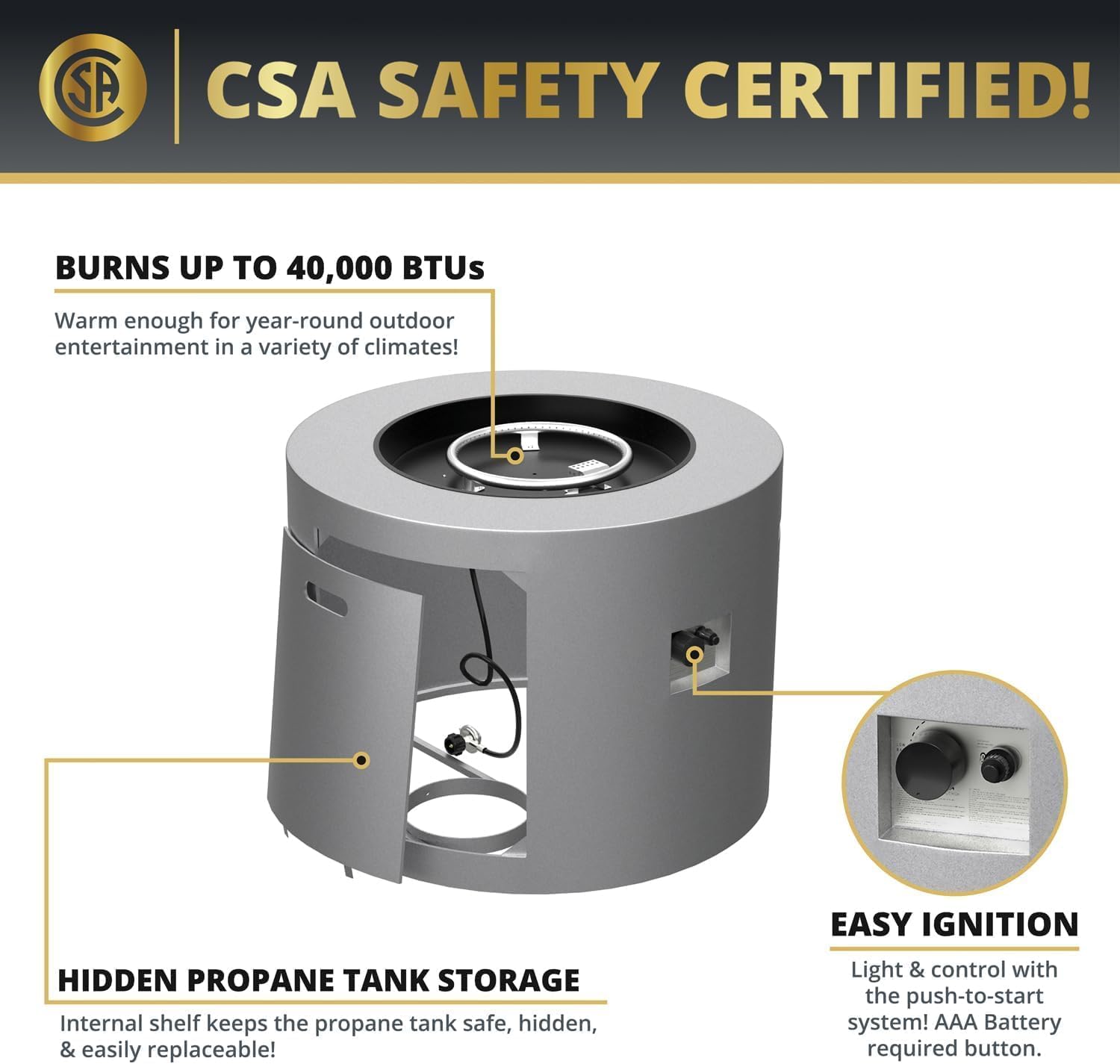 - 【Premium Quality Construction】Crafted from high-quality, heat-resistant alloy steel, this outdoor fire pit table is built to last. The color-coated finish ensures long-lasting vibrancy, while the CSA-certified propane system guarantees clean combustion with no ash or smoke. It’s an eco-friendly and health-conscious choice for outdoor heating.