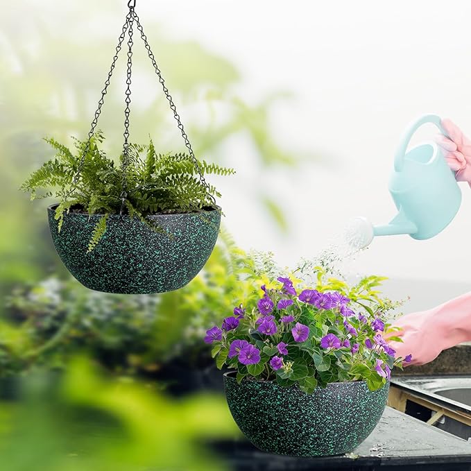 10inch Hanging Planters for Outdoor Indoor Plants with Drainage Holes and Chain, 2 Pack Round Hanging Flower Pots for Garden Home Porch Decor, Black with Green Speckles