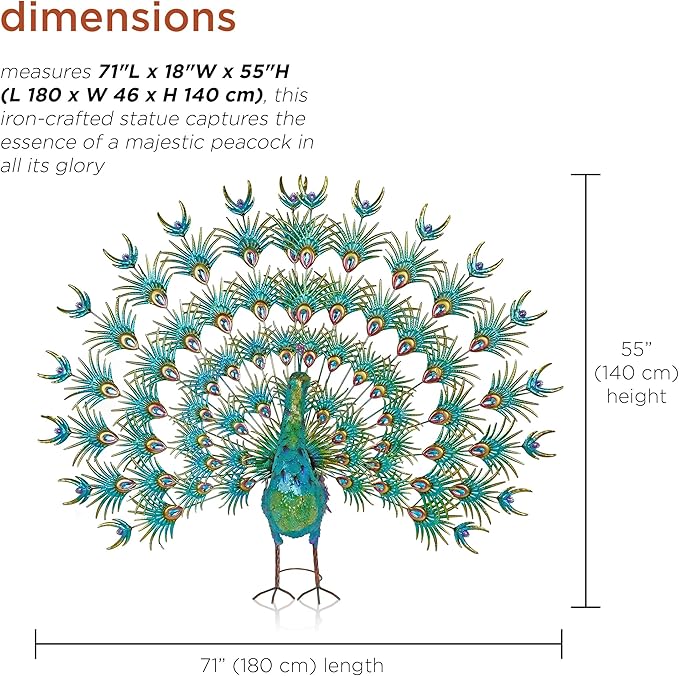 - STUNNING METAL PEACOCK STATUE: Bring an air of majesty to your space with this peacock statue, featuring its gorgeous feathers on full display